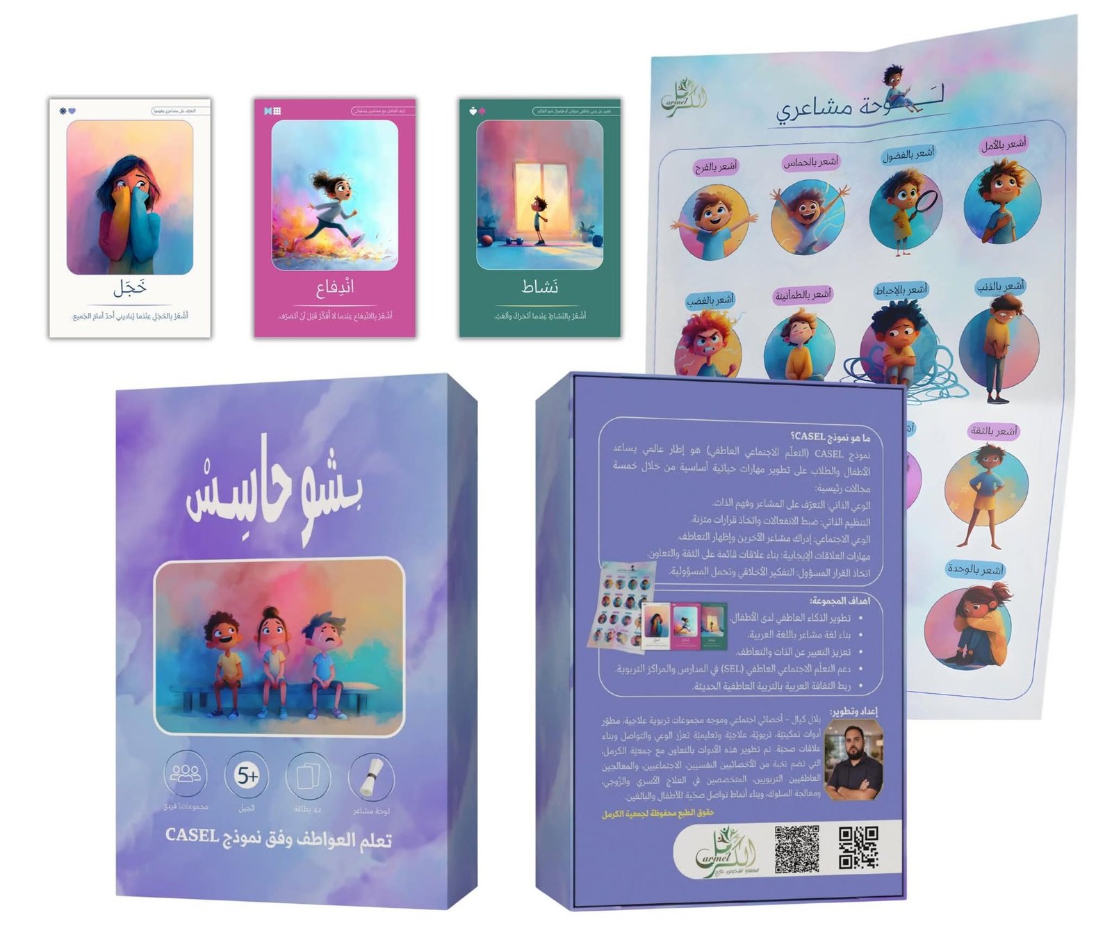 تحتوي مجموعة “بشو حاسس” على بطاقات تفاعلية بالإضافة إلى لوحة مشاعر تساعد الطفل على تحديد حالته الشعورية بشكل يومي، مما يعزز من وعيه الذاتي ويشجعه على التعبير بشكل مستمر. كما أن تصميم البطاقات الجذاب والألوان المبهجة يجعل الطفل أكثر انجذابًا لاستخدامها والتفاعل معها.