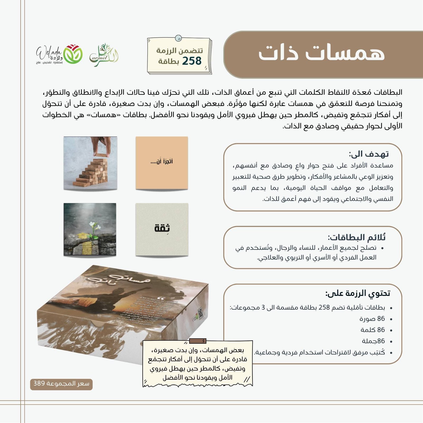 تُعد بطاقات همسات ذات من المنتجات المميزة في مجال التطوير الذاتي والتأمل، حيث تقدّم تجربة عميقة تساعدك على إعادة الاتصال بنفسك وفهم مشاعرك بطريقة أكثر وعيًا وهدوءًا. فهي ليست مجرد بطاقات تحفيزية، بل وسيلة يومية لبناء حوار داخلي إيجابي يعزز من سلامك النفسي وتوازنك العاطفي.