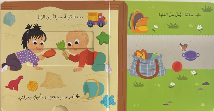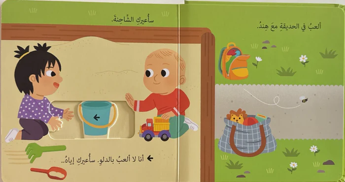 تدور أحداث القصة حول طفل يلعب في الحديقة مع صديقته، حيث يتشاركان الألعاب معًا بطريقة لطيفة. يقوم الطفل بإعارة دلوه لصديقته، بينما تعيره هي مجرفتها، فيتبادلان اللعب ويستمتعان بوقتهما معًا. من خلال هذا الموقف البسيط، يتعلم الطفل أن المشاركة تجعل اللعب أكثر متعة وتخلق علاقات أفضل مع الآخرين.