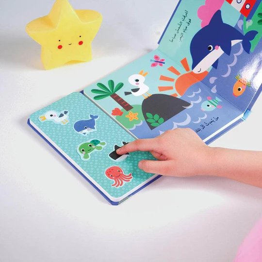 تم تصميم الكتاب بطريقة تجعل التعلم ممتعًا وتفاعليًا، حيث يمكن للطفل الضغط على الأزرار الصوتية للاستماع إلى أصوات مختلفة لكل كائن بحري، مما يعزز مهارات الانتباه والاستماع لديه، ويقوي قدرته على التمييز بين الأصوات المختلفة وربطها بما يراه على الصفحة.